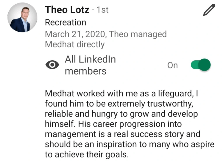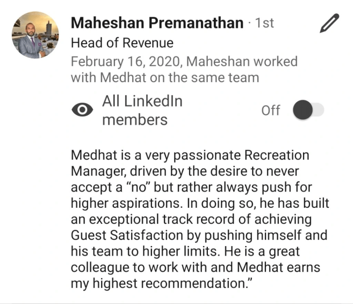 I started my journey in hospitality as a lifeguard in Savoy Hotels in Sharm El-Sheikh in 2010. Three years later, I moved to the United Arab Emirates as a lifeguard at Le Meridien Mina Seyahi in Dubai. My passion and dedication helped me grow into a Recreation Supervisor in 2013, then Assistant Recreation Manager, and eventually Cluster Recreation Manager at Coral Beach Resort Sharjah and Ajman Palace Hotel. I later joined Kempinski Royal Maxim Palace in Cairo as Recreation Manager and now serve as Recreation Manager at Rixos Premium Seagate in Sharm El-Sheikh. I graduated from the Faculty of Education at Assiut University in 2007, but my heart has always been in the recreation and leisure field.